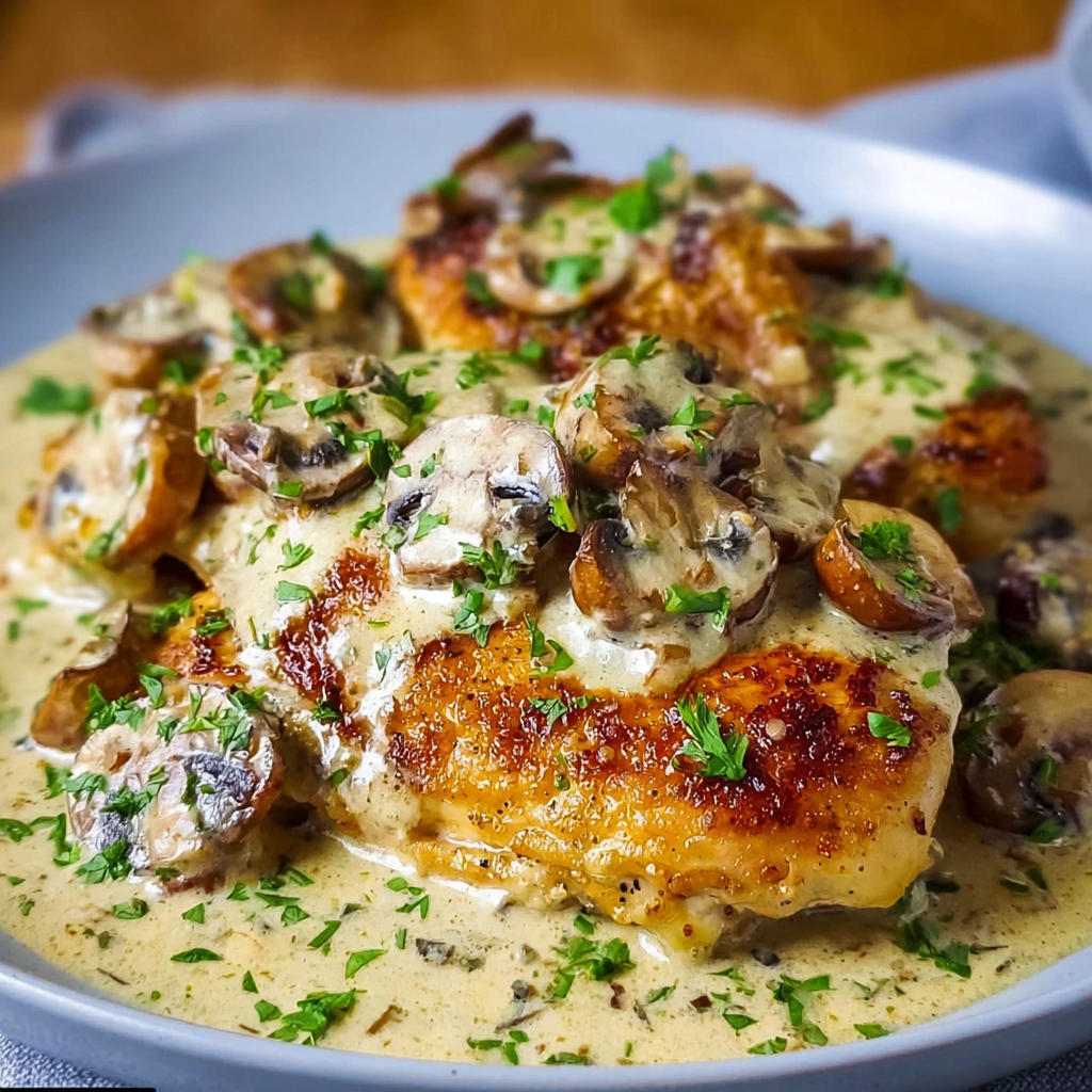Return the chicken (and any juices from the plate) to the skillet. Spoon the creamy sauce over the chicken and serve immediately.
