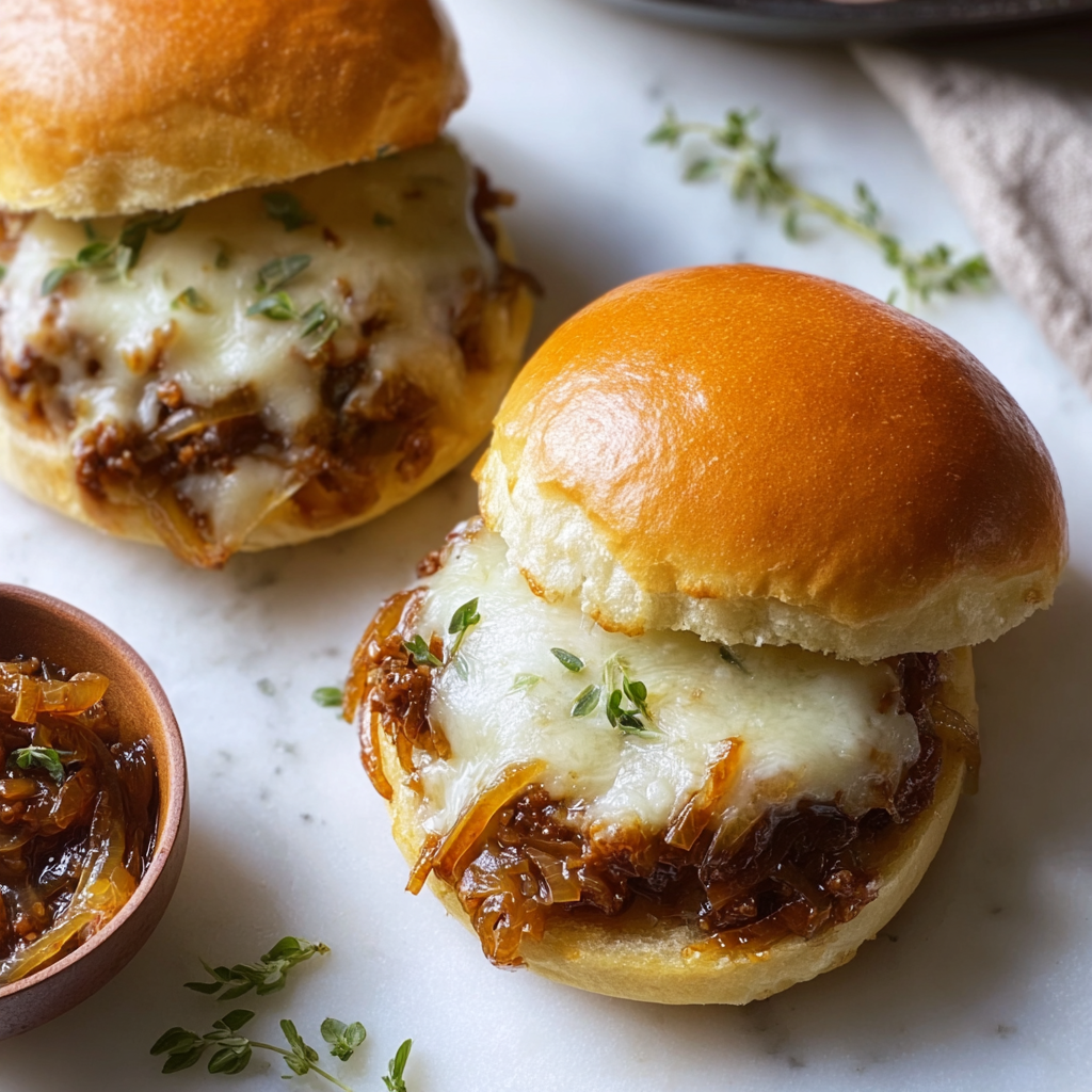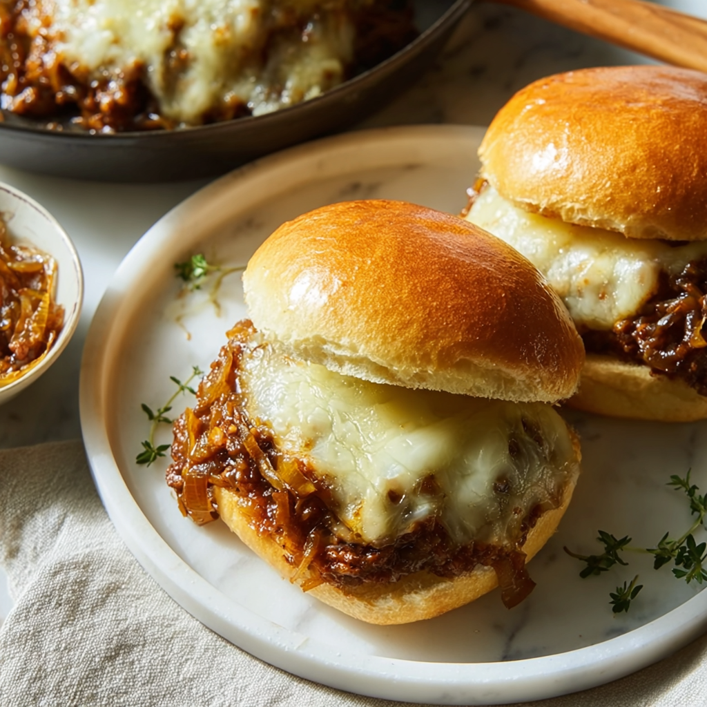 This gourmet twist on the childhood classic marries the deep, savory flavors of French Onion Soup with the messy, hand-held comfort of a Sloppy Joe. Sweet caramelized onions and juicy ground beef are simmered in a rich thyme-infused gravy, then piled onto toasted buns and topped with bubbly, melted Gruyère or Swiss cheese.+1
