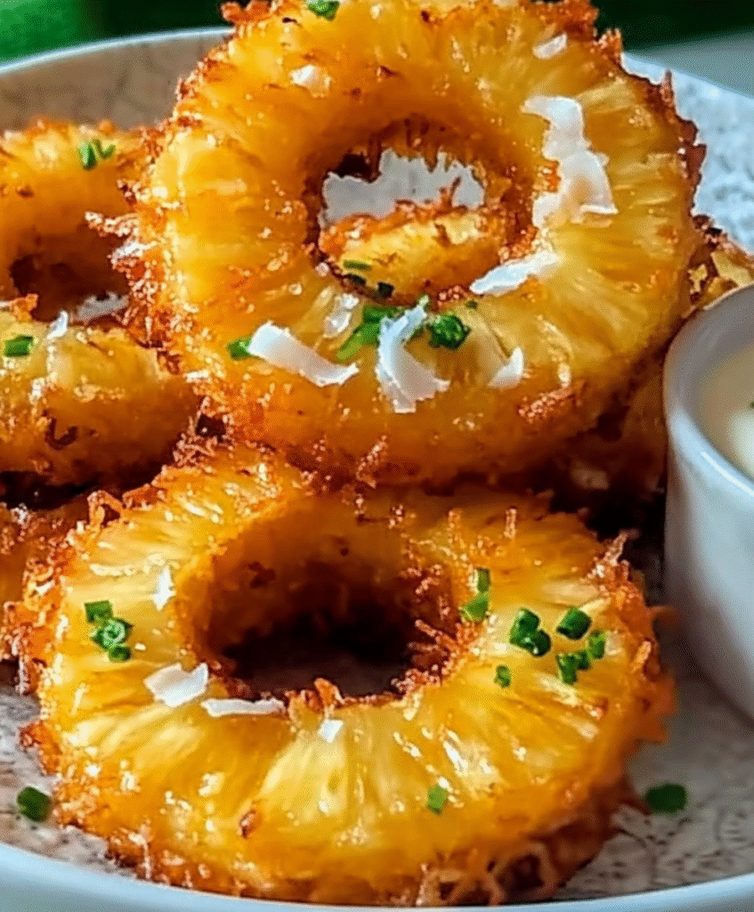 Fried Pineapple Rings with Creamy Coconut Dipping Sauce: A Tropical Vacation on a Plate