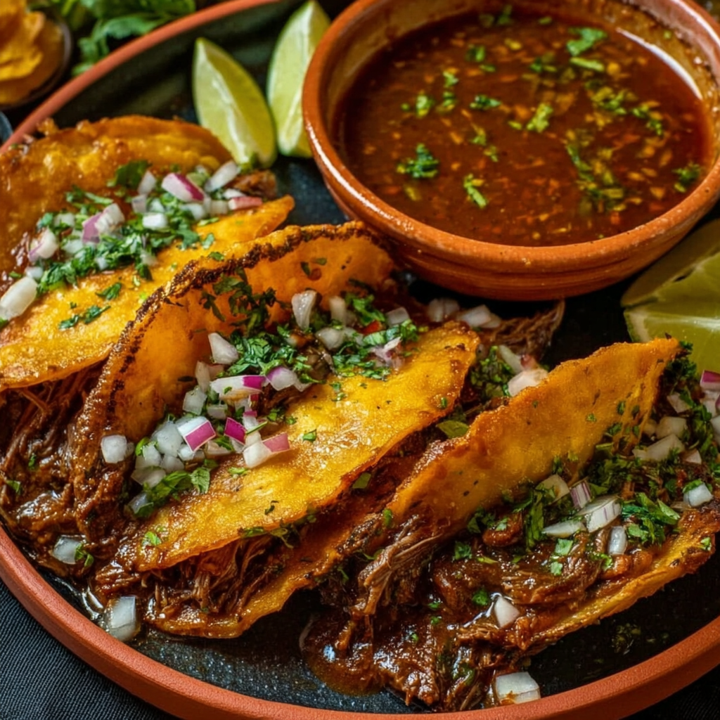 This Birria Tacos Recipe delivers tender, slow-braised beef, rich chile consommé, and crispy cheese-filled tortillas for an unforgettable meal. Perfect for gatherings or comfort food cravings, these tacos are bold, juicy, and deeply satisfying. Try them today, share your feedback below, and subscribe for more authentic Mexican recipes!