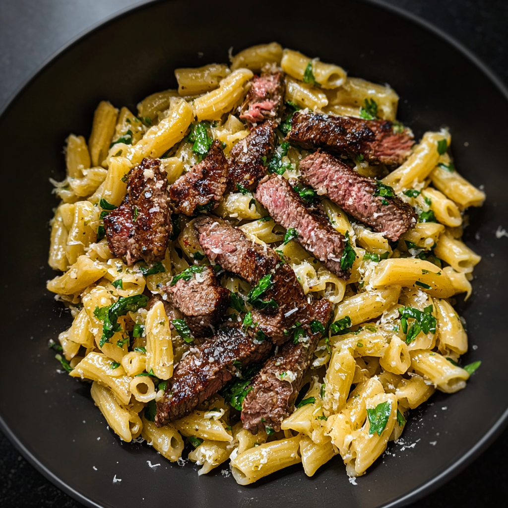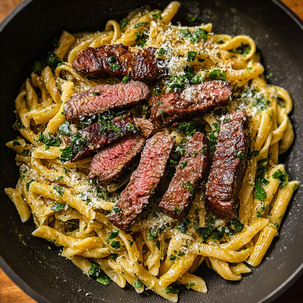 Add the cooked pasta and the steak (along with any juices) back into the skillet. Toss for 1–2 minutes over medium heat until the sauce thickens and coats the pasta perfectly. Turn off the heat and fold in the Parmesan cheese and parsley.